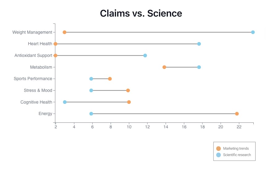 Signals’ Claims vs. Science analysis shows support for weight-related benefits. A systematic review of 32 studies found Yerba Mate improves metabolism and has antioxidant and anti-inflammatory effects. One RCT even showed a statistically significant reduction in body fat among participants taking active Yerba Mate extract, though changes in weight and BMI didn’t reach significance.